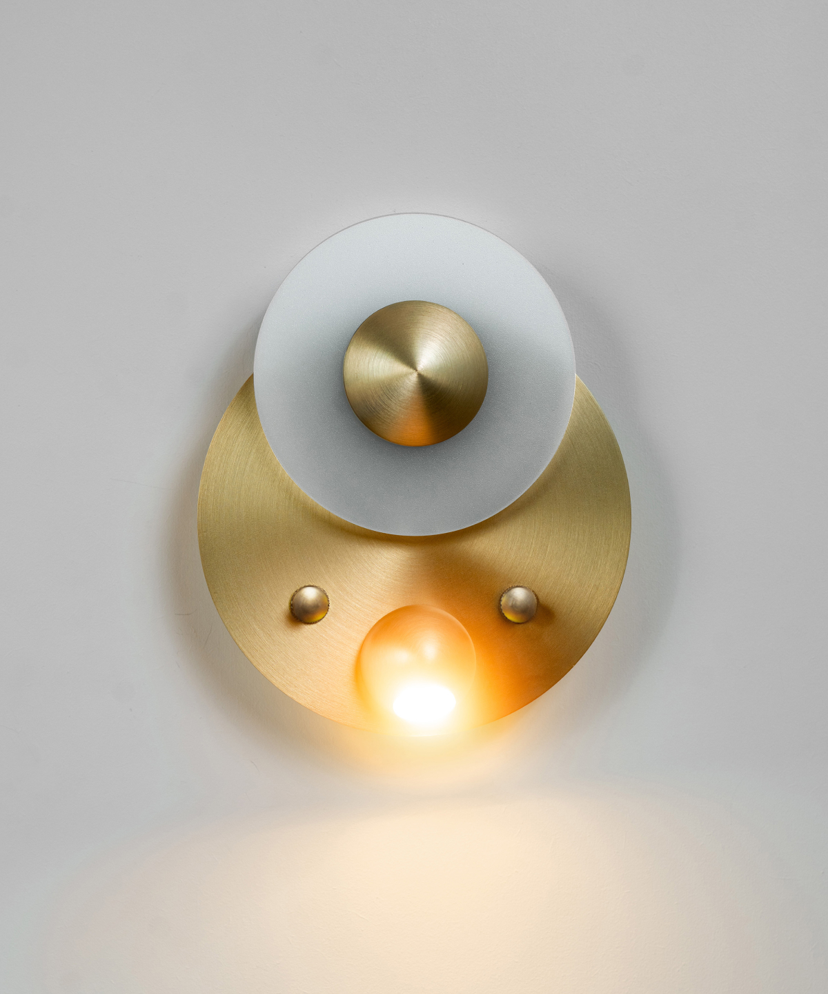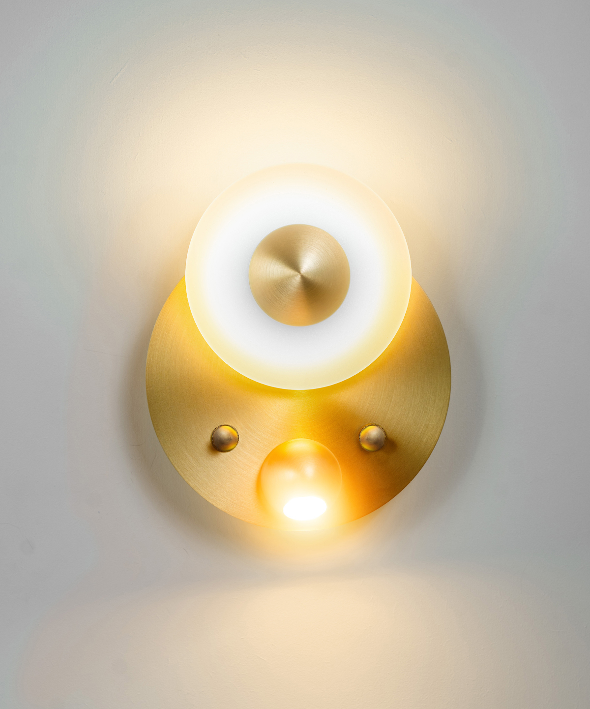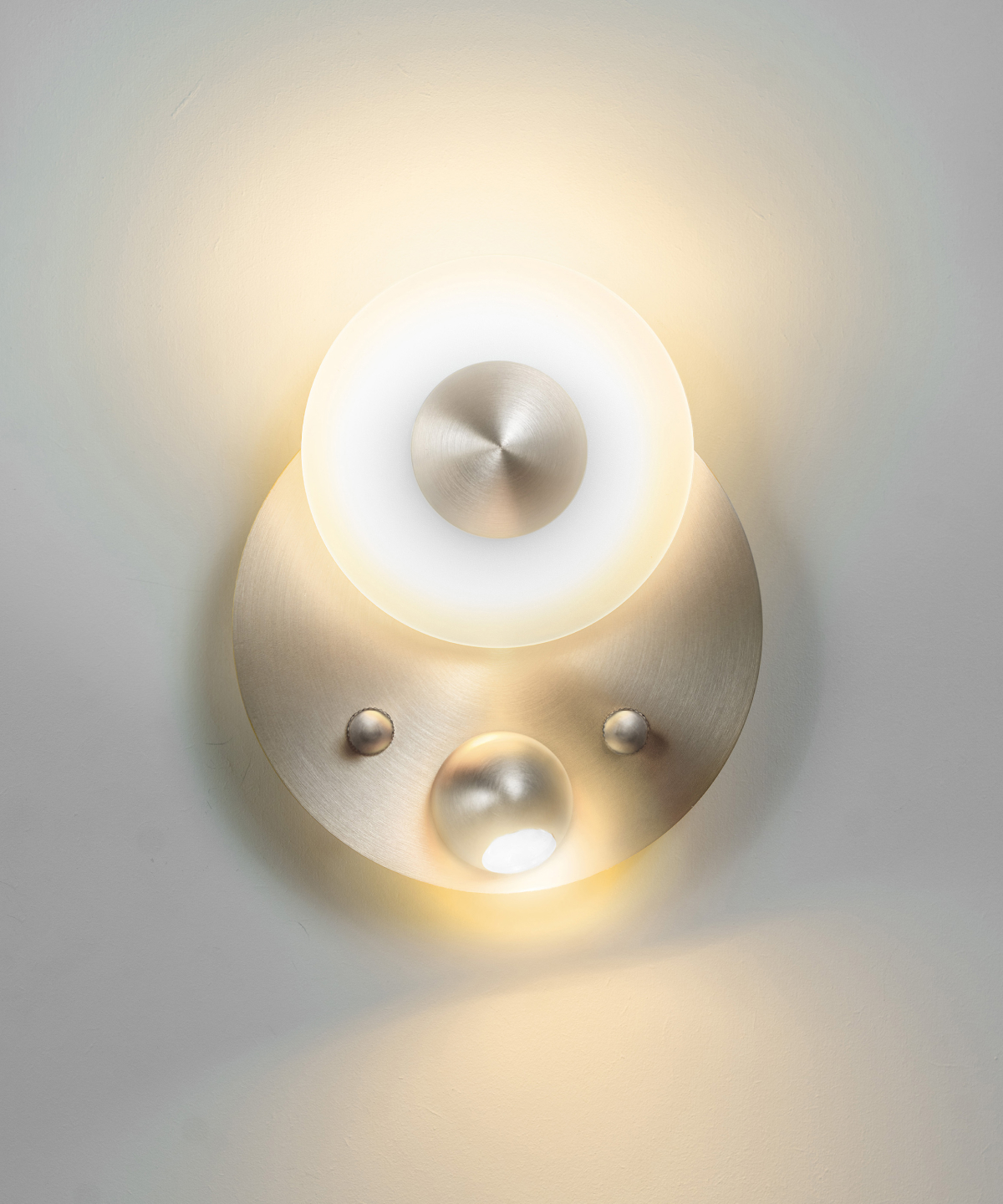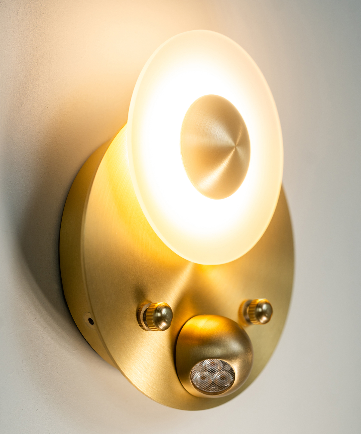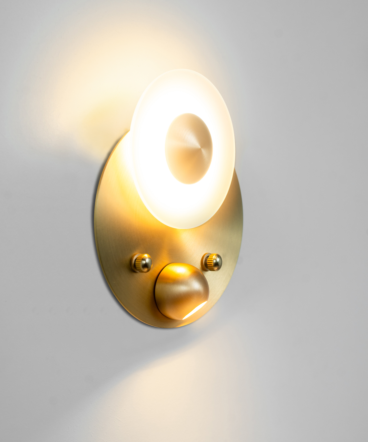Chaque modèle est doté d’interrupteurs intégrés, discrets et intuitifs, offrant un contrôle indépendant des sources. Son design circulaire en laiton brossé, aux lignes épurées, conjugue élégance contemporaine et fonctionnalité.